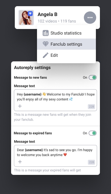 Dai il benvenuto ai tuoi nuovi fan automaticamente quando si iscrivono al tuo FanClub. Componi un messaggio coinvolgente in maniera tale che ti rispondano per inviare foto & video privati. Puoi anche impostare messaggi automatici per i fan che hanno annullato l'iscrizione al tuo Fanclub.